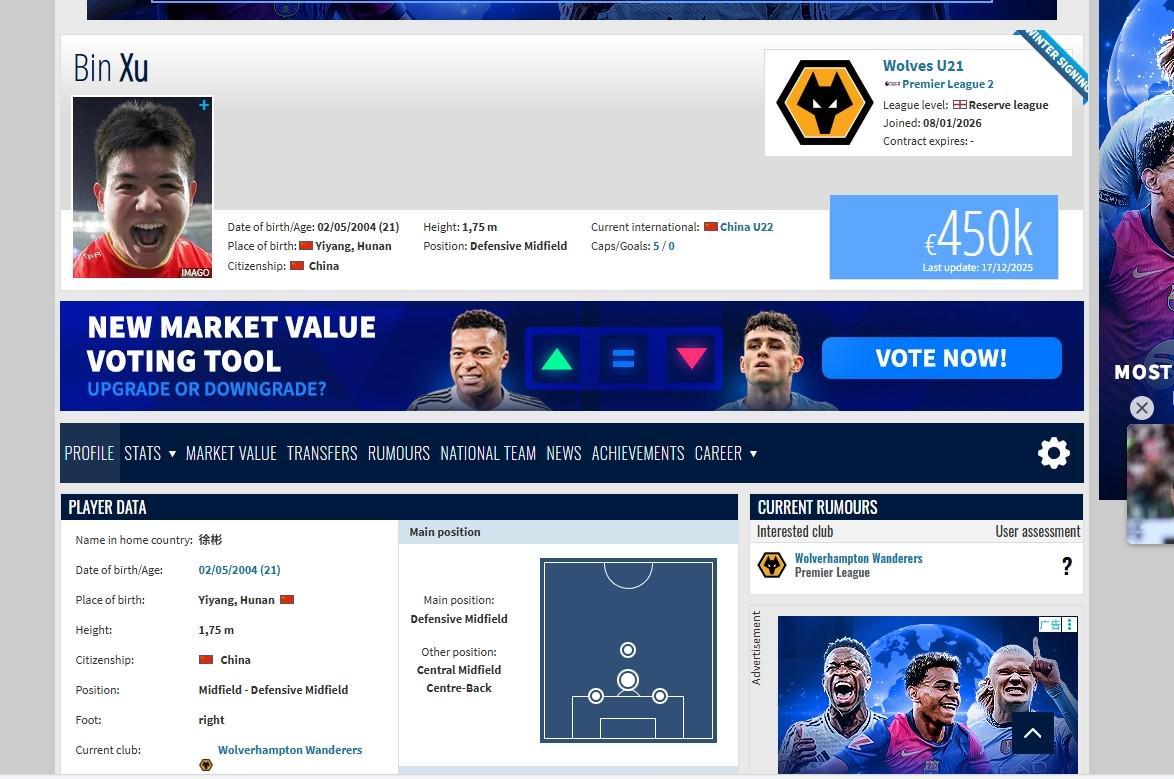 世界杯在线观看-在欧洲开启新挑战,德转显示徐彬正式加盟狼队U21梯队